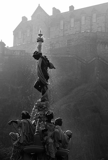 Hazy sunshine backlighting the Ross fountain in Edinburgh's Princes Street Gardens.